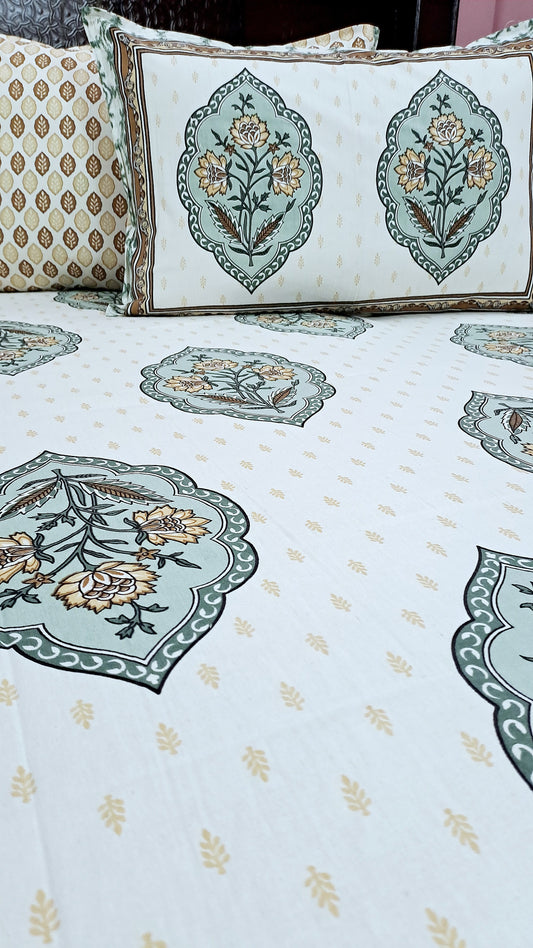 Satrangi Pure Cotton Sanganeri Print Double Bedsheet - Green Leaf