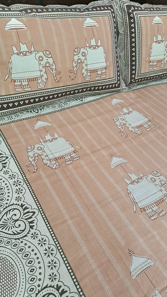 Gulabi Nagri Haathi Pure Cotton Double Bedsheet - Peach