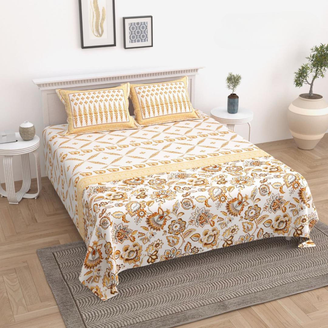 Satrangi Pure Cotton Sanganeri Print Double Bedsheet - Yellow Circle