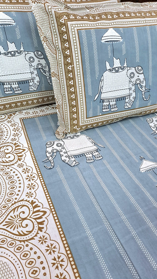 Gulabi Nagri Haathi Pure Cotton Double Bedsheet - Blue