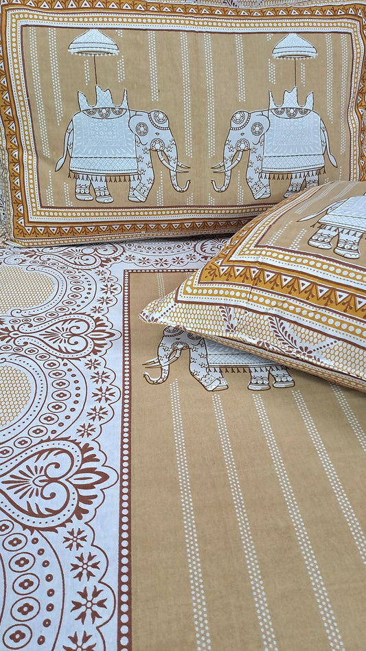 Gulabi Nagri Haathi Pure Cotton Double Bedsheet - Yellow