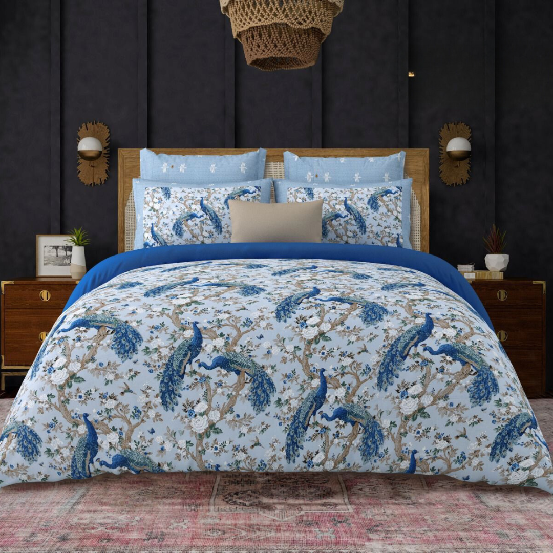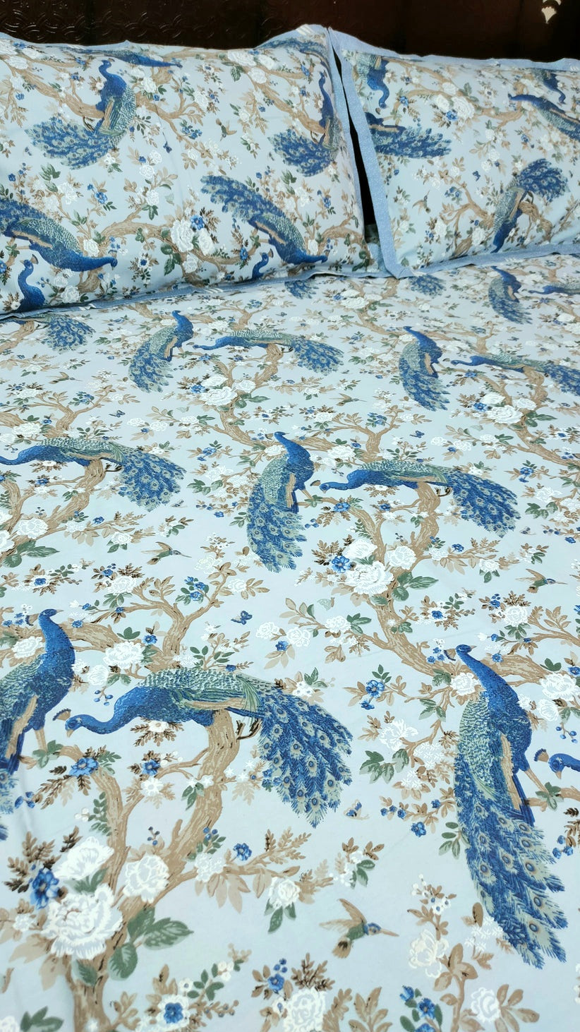 Spring Beauty 100% Cotton Twill Cotton Double Bedsheet King Size - Blue Peacock Dance