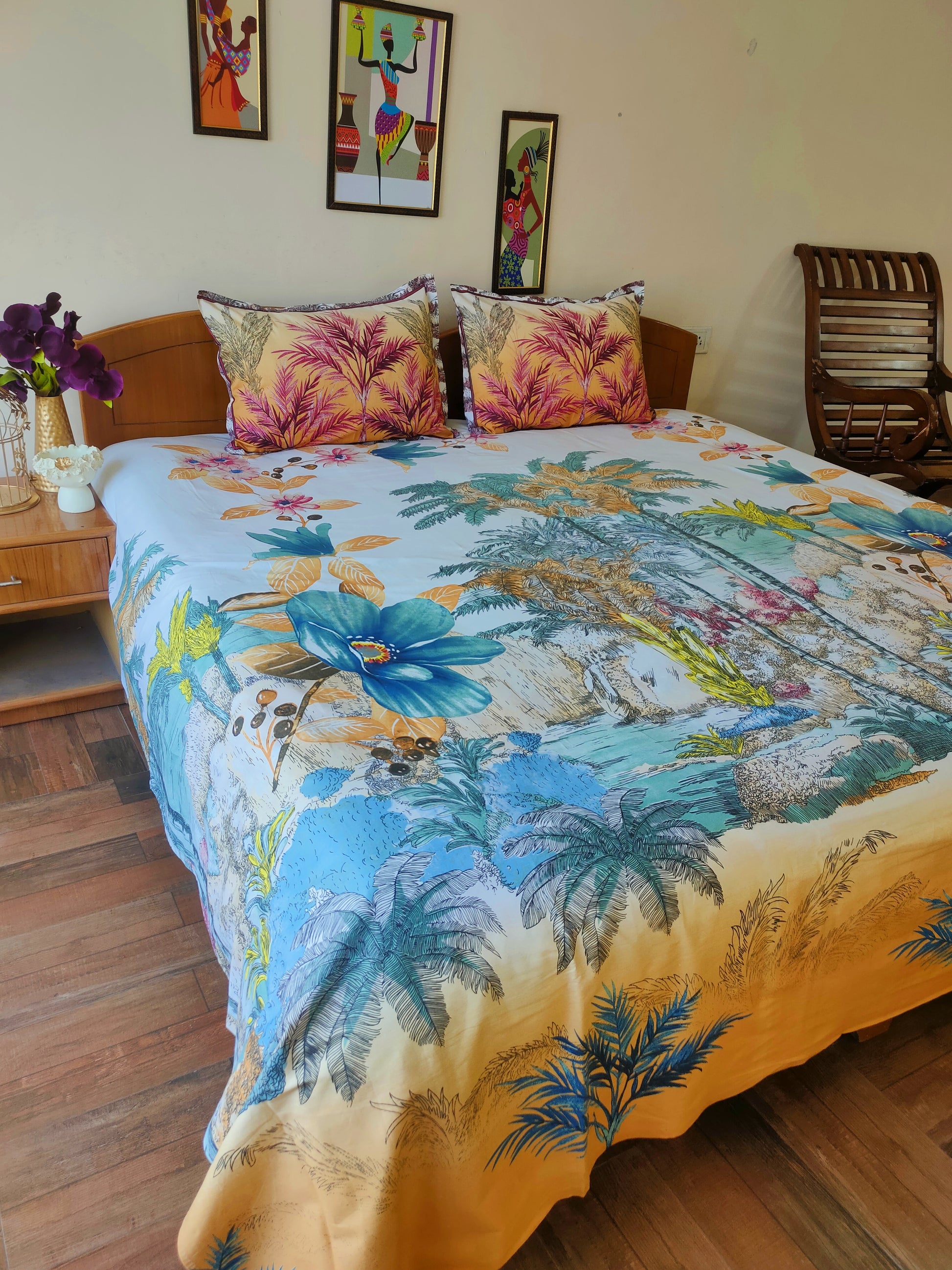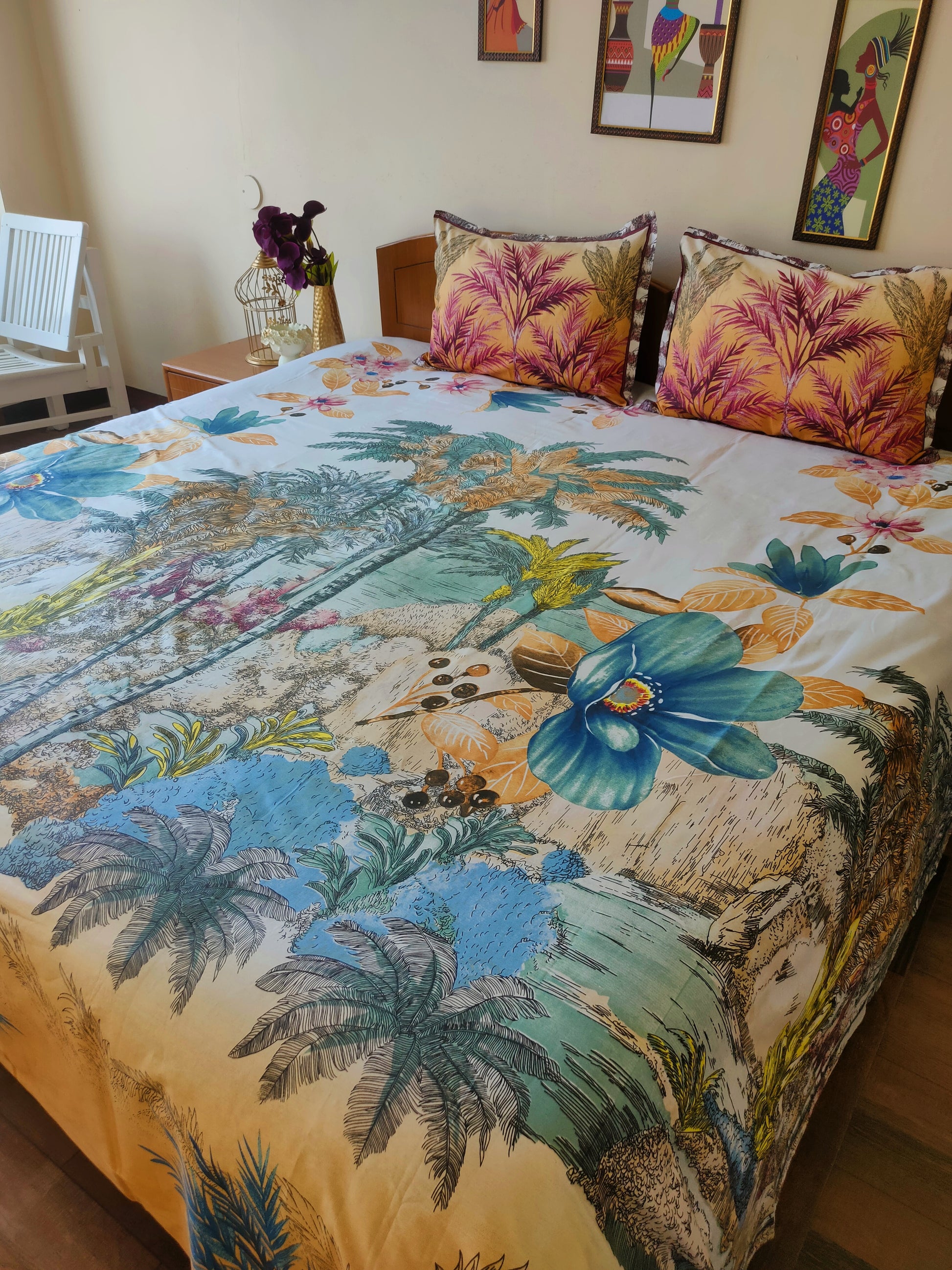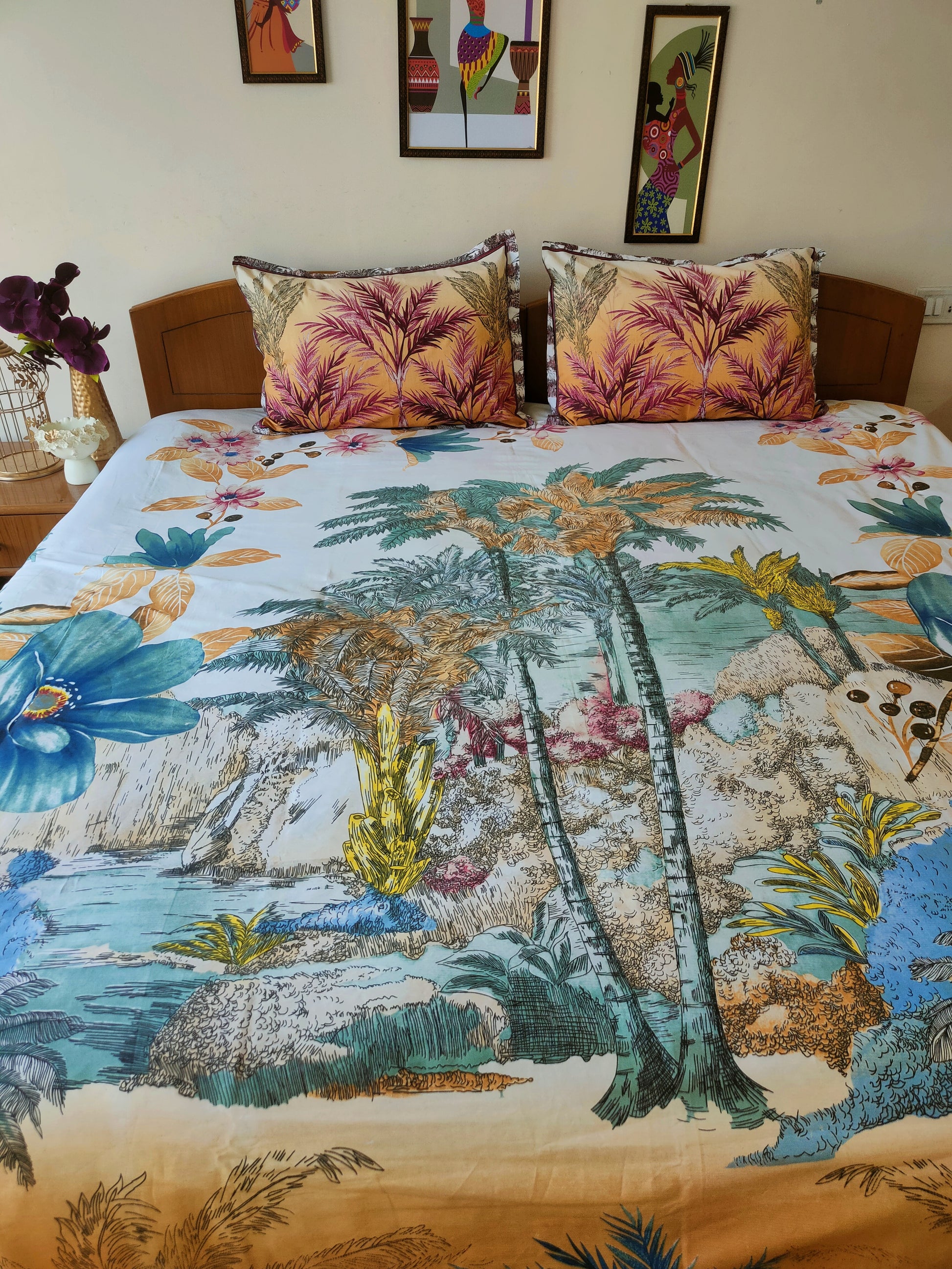 Diana Beach and Tree 100% Cotton Double Bedsheet King Size -White and Yellow